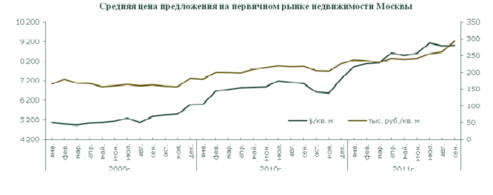 Так, по данным эксперта, в августе 2008 года стоимость кв. м на первичном рынке составляла 6009 $, на рынке вторичного жилья – 7 364 $. В сентябре текущего года цена кв.м. на рынке первичного жилья составляла 9 009 $, а на вторичном рынке 6 651 $. То есть стоимость кв.м. в новостройках выросла с августа 2008 на 49,9 % , а вторичное жилье напротив снизилась в цене на 9,7 %. (Данная цена рассчитывается с учетом элитных предложений ЦАО).