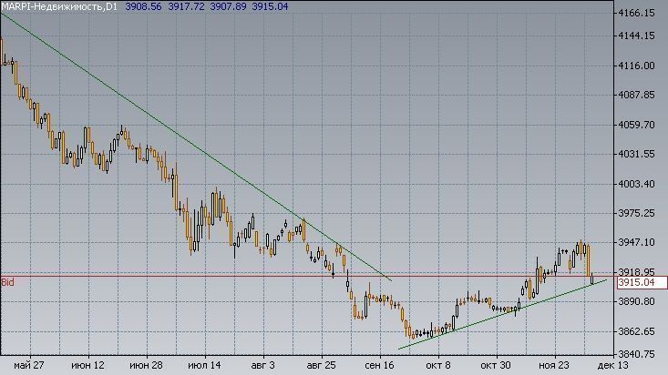 В последний день минувшей недели Индекс столичной недвижимости пробил ряд ключевых уровней. Во-первых, в районе $3935 было преодолена линия поддержки восходящего канала, сформированного в начале ноября. Ниже (у отметки $3930) располагалась и еще одна сильная поддержка в лице 200-дневной скользящей средней. При этом технически индекс выглядит весьма перепроданным, и на этом фоне возможна некоторая краткосрочная стабилизация.