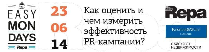 Ассоциация профессионалов рынка недвижимости REPA и коммуникационное агентство Kestler&Wolf приглашают на традиционный бизнес-завтрак «Легкий понедельник», который состоится 23 июня 2014 г. Тема встречи: «Как оценить и чем измерить эффективность PR-кампании?». Мероприятие пройдет при поддержке журнала «Дайджест российской и зарубежной недвижимости». Партнером по видеосъемке выступает студия «Скарабей Продакшн».