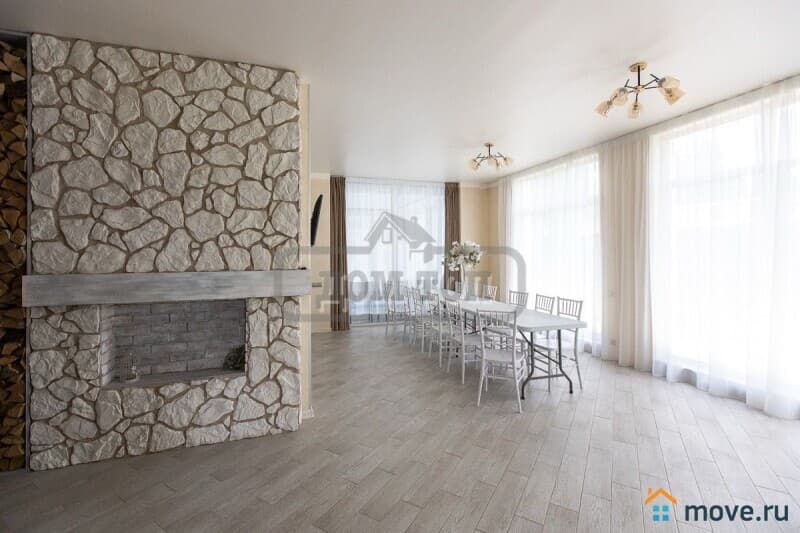 В доме есть доме есть уютная гостиная с панорамным остеклением с декоративным камином и большим столом на 20 персон, где можно провести камерный банкет или фуршет с красивой фотосессией.