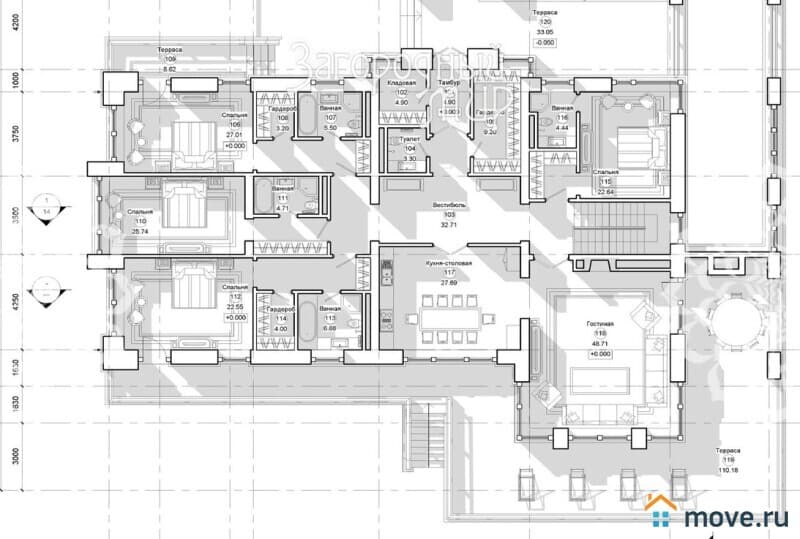 По проекту в доме уютная гостиная с камином, оборудованная кухня-столовая, 6 спальных комнат со своим с/у и гардеробной (три – с выходом на террасу), кабинет, просторный холл, большая терраса с видом на залив и канал им. Москвы, помещение для проживания обслуживающего персонала.