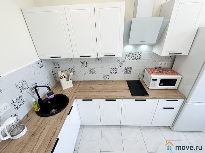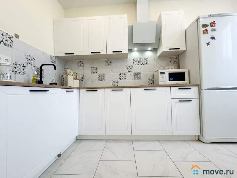?? Кухня с техникой: холодильник, плита, микроволновка, чайник.