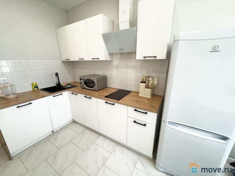 ?? Кухня с техникой: холодильник, плита, микроволновка, чайник.