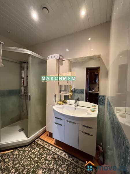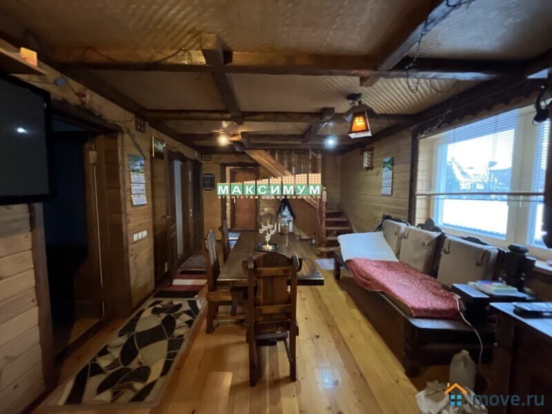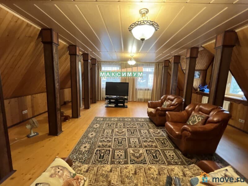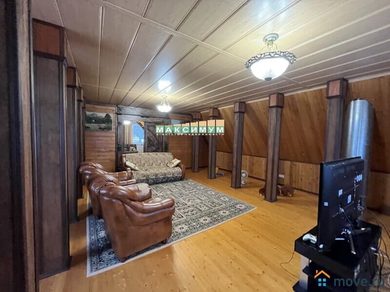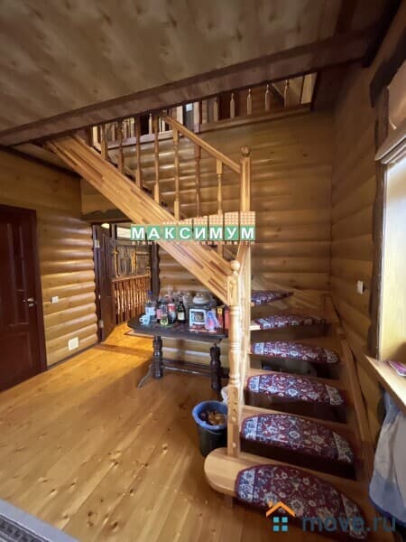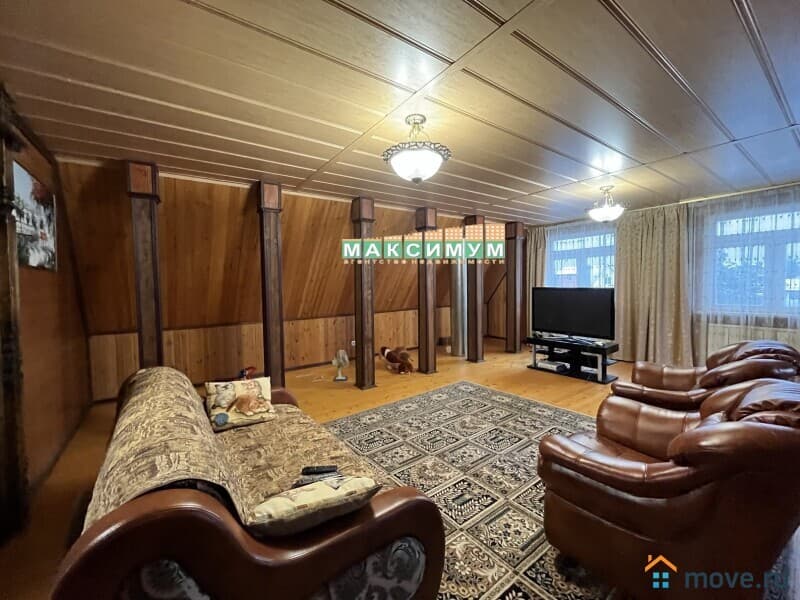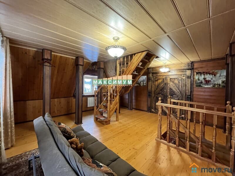 На первом этаже расположены: уютная гостиная 38 кв.м., холл, веранда, лестница на 2 этажа из лиственницы, кухня 20.5 кв.м., раздельный санузел с душевой кабиной
