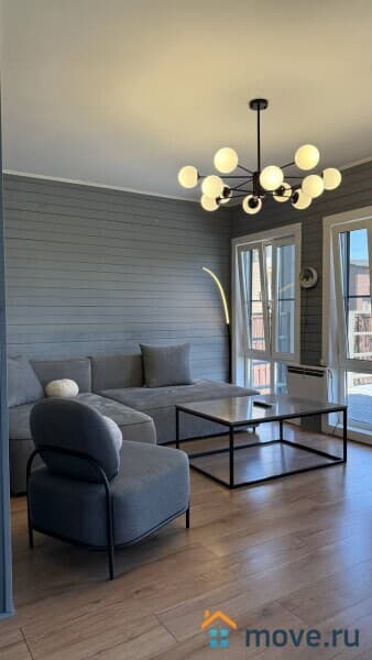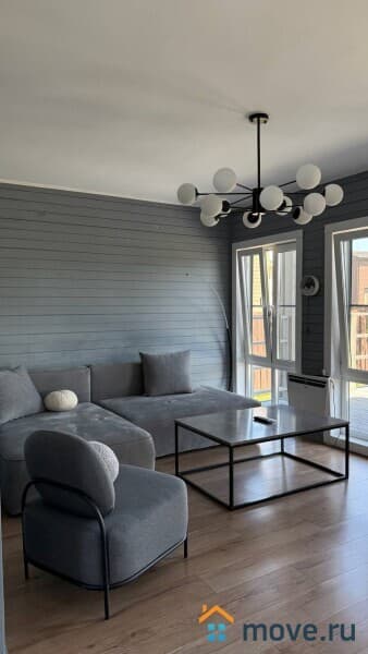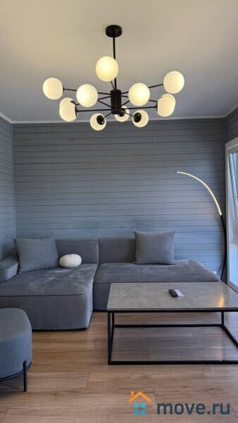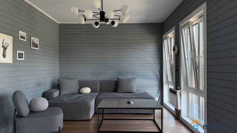 * Просторная гостиная с мягким диваном и панорамными окнами