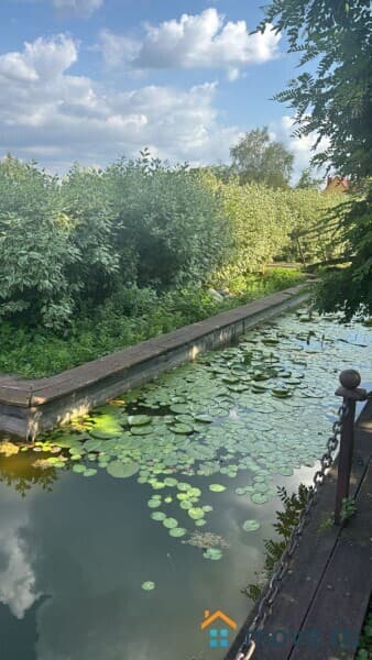 УЧАСТОК: 50 соток. Ухоженная зеленая территория. Высажены кустарники и цветы, газон. Дорожки облагорожены. Есть искусственный пруд с мостиком. Растут хвойные и лиственные деревья. Территория освещается в темное время суток. Мангальная зона. Парковка на 15 автомобилей.