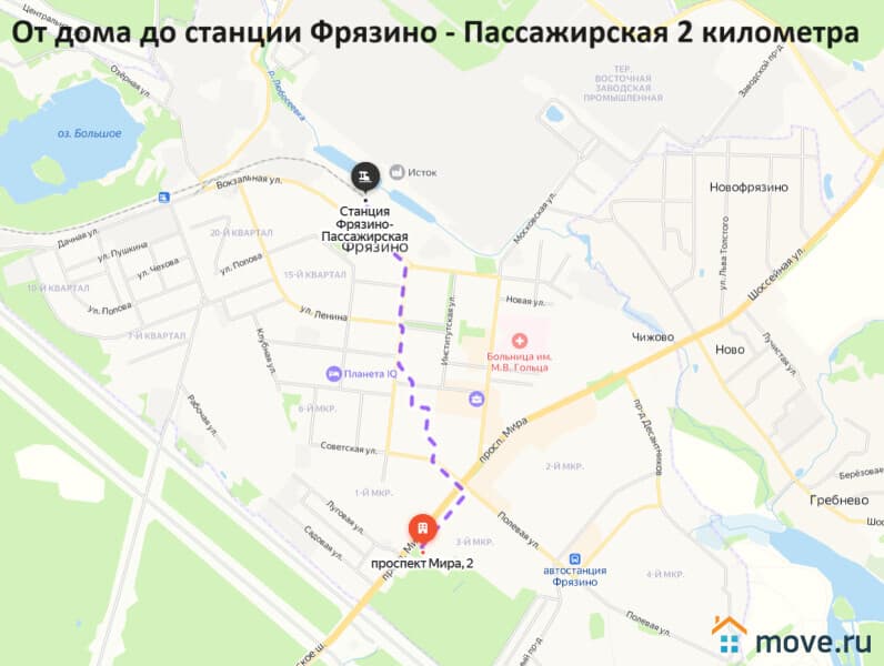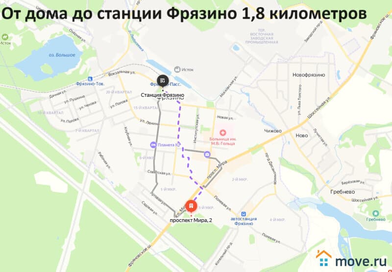 Удобная транспортная доступность: до автобусной остановки 100 метров, до платформы Фрязино 1,8 километров, до платформы Фрязино-Товарная 2 километра.