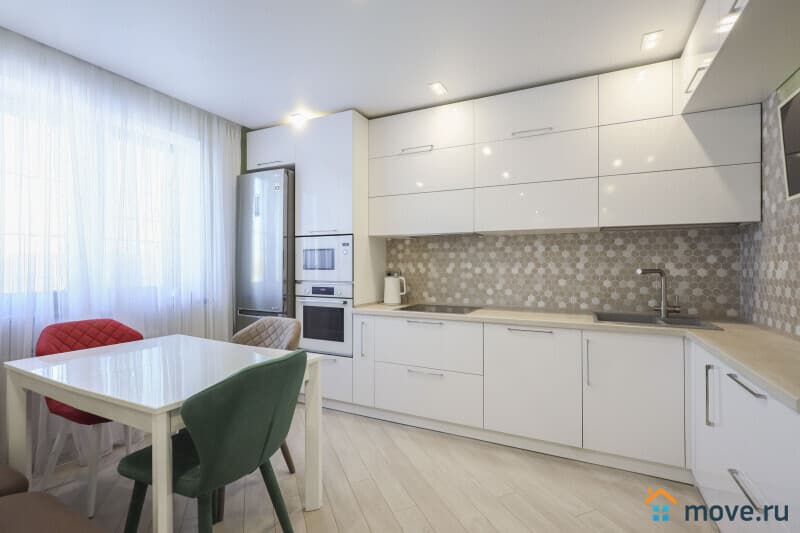 • Просторная кухня, позволит с комфортом собраться всей семьёй, там вас уже будет ждать удобный гарнитур с встроенной техникой, которые облегчат процесс приготовления пищи с первого дня проживания.