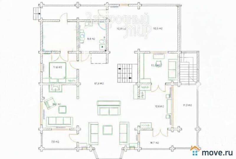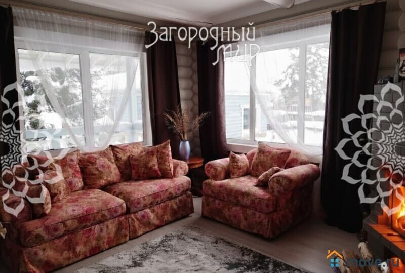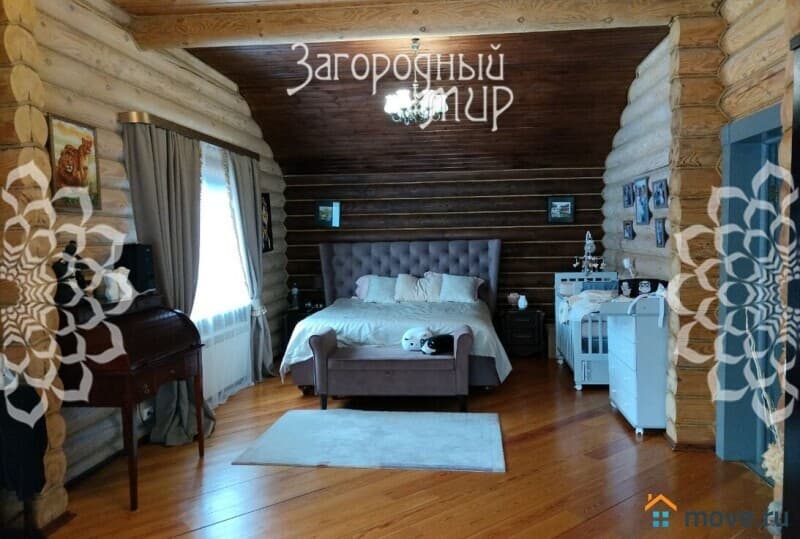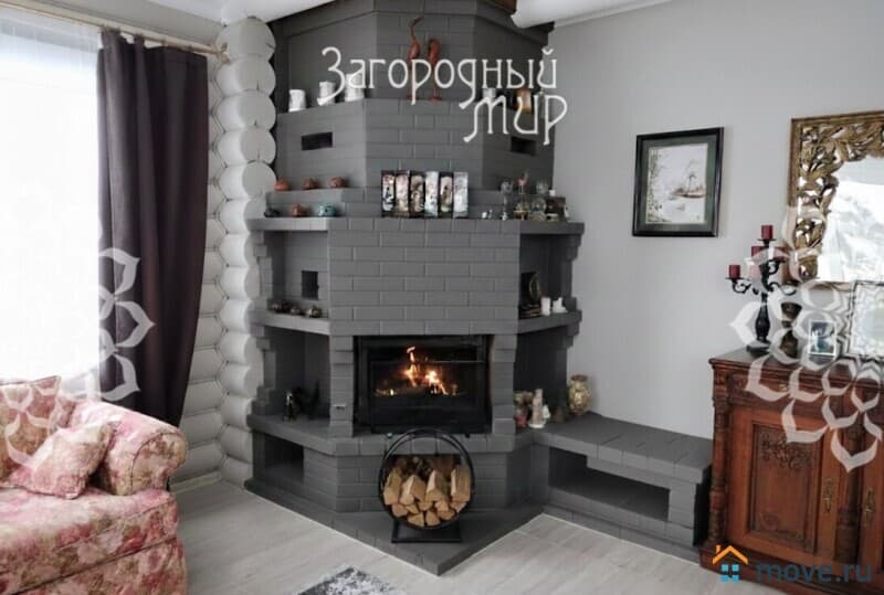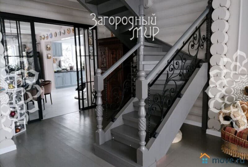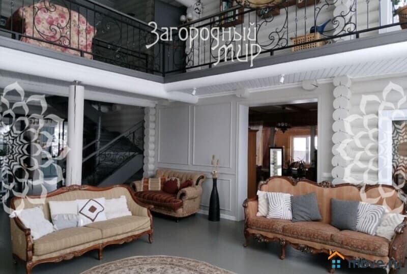 Дом из оцилиндрованного бревна в 2 этажа с монолитным цокольным подвалом, фактически — дополнительным этажом, снаружи оштукатурен и покрашен. Отделка «под ключ». Общая площадь дома 407 кв. м, по документам — 390 кв. м. Пристроена зона кухни из керамического блока. Мягкая кровля для хорошей звукоизоляции. Качественные пластиковые стеклопакеты REHAU.