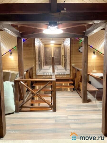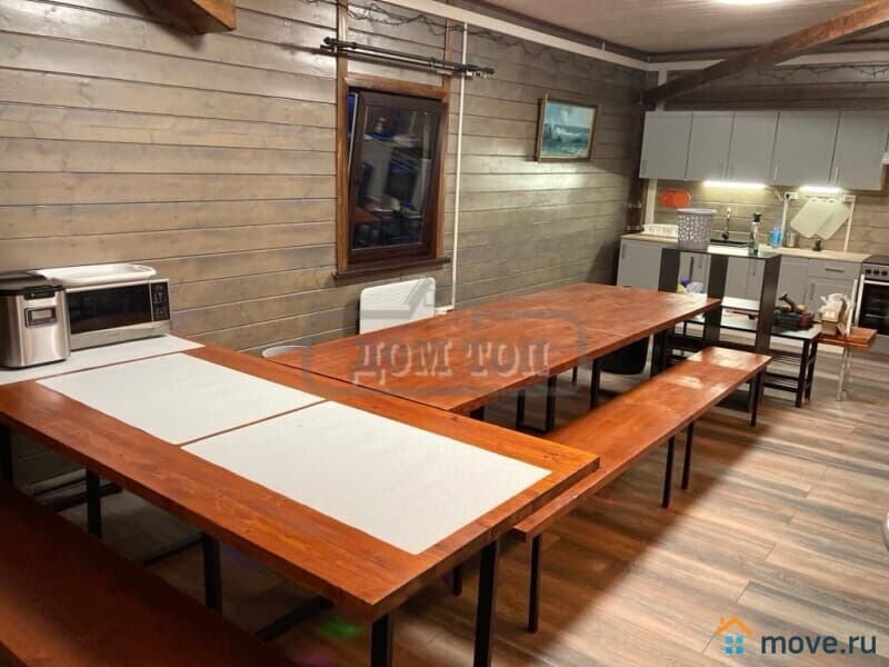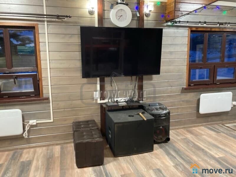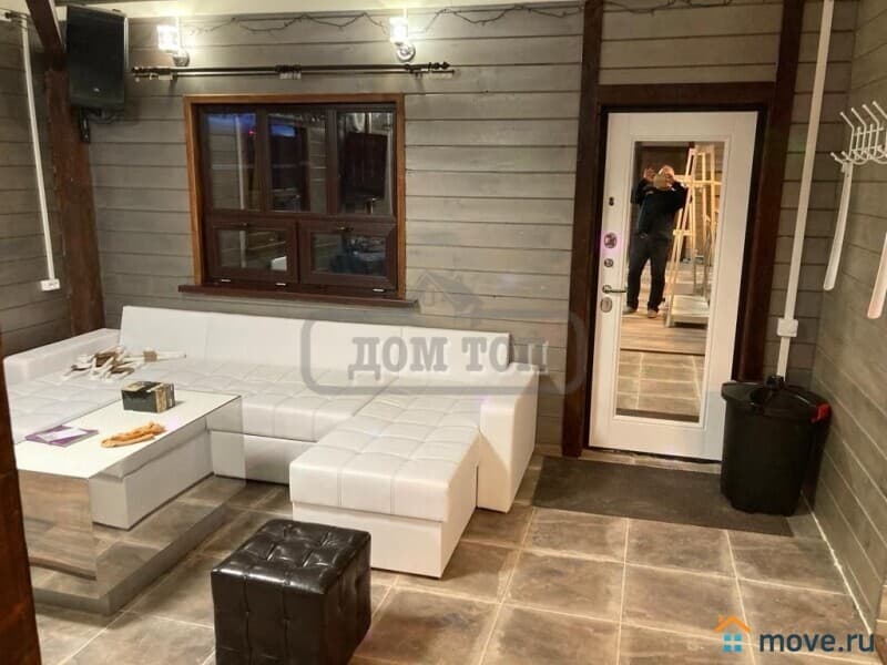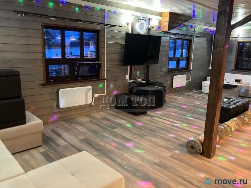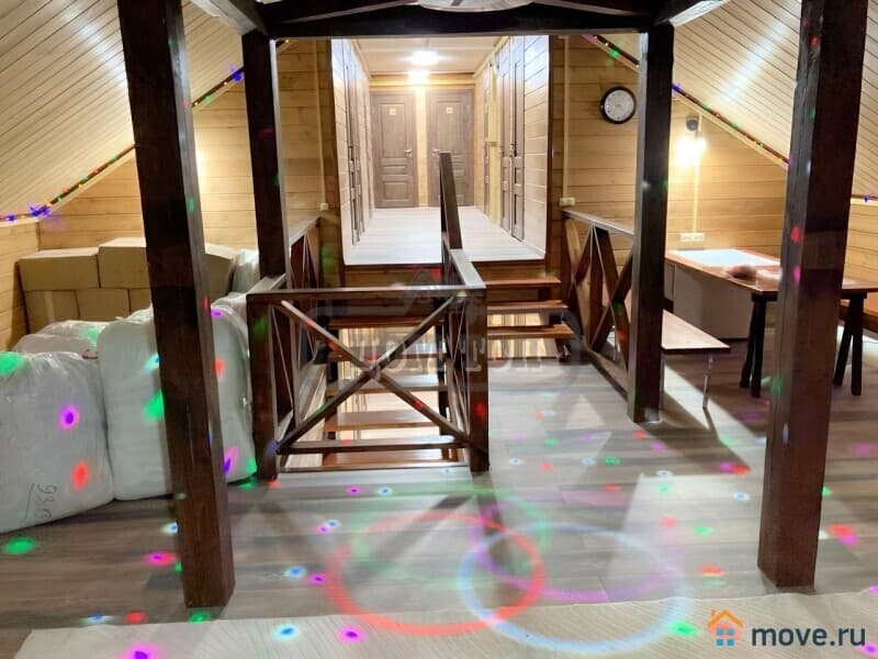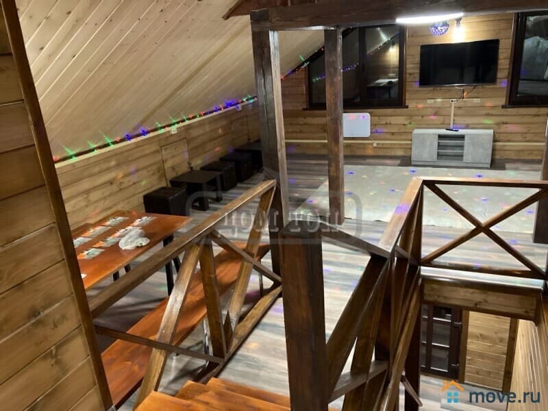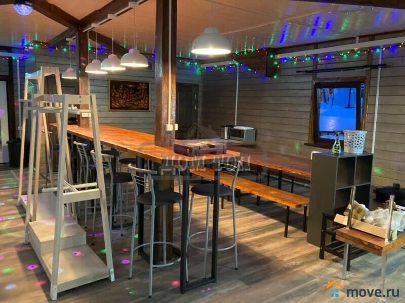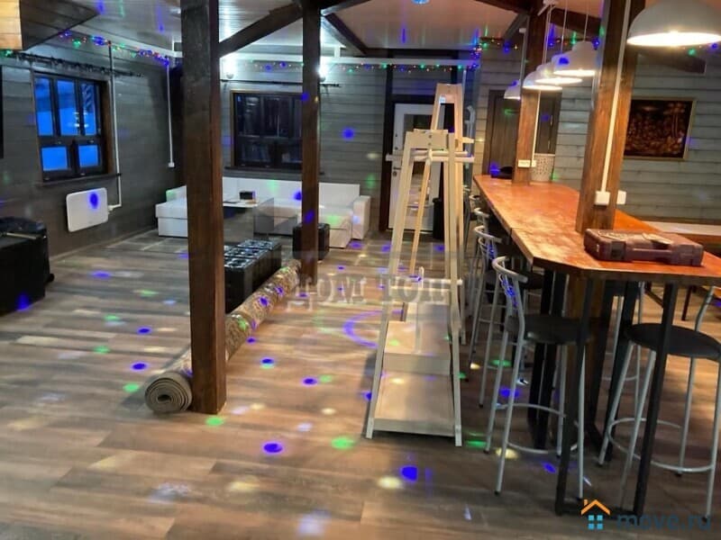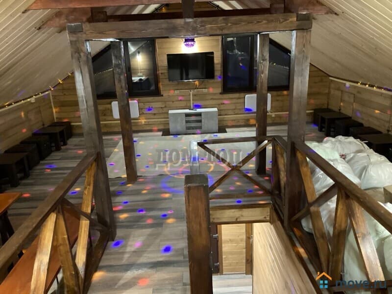 На 1-м этаже: гостиная 78 кв.м. с барной стойкой на 15 персон, зоной кухни с необходимой посудой и техникой, кальянной зоной на 8-10 персон, лаунж зоной на 8-10 персон, танцпол 22 кв.м. с профессиональным караоке, с/у, выход к беседке во внутренний дворик с мангалом. Холл с лестницей на 2-й этаж 16 кв.м. с отдельными закрывающимися шкафчиками для зимней одежды и обуви, и открытой стойкой для лыж и сноубордов. Спа-зона.