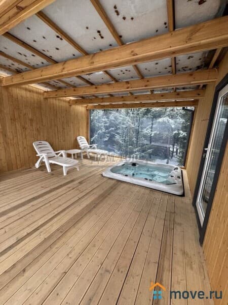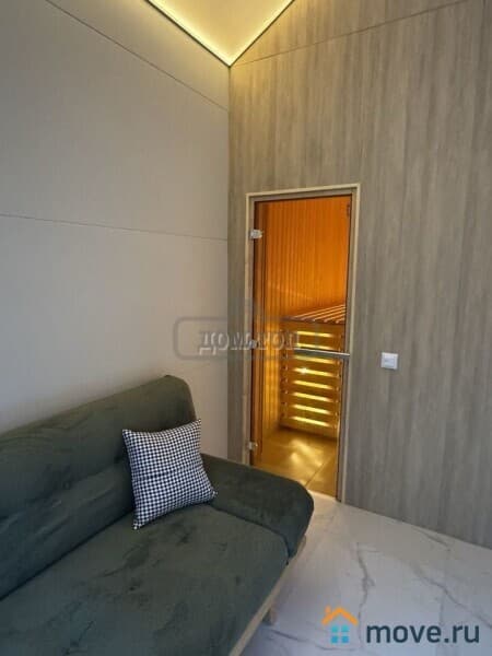 1 ЭТАЖ: Огромная кухня-гостиная с парящим камином и двумя диванами, панорамные окна, колонка со встроенным караоке, большой обеденный стол, спальня и санузел с душевой, большая гардеробная, просторная терраса с джакузи, сауна с душевой и санузлом