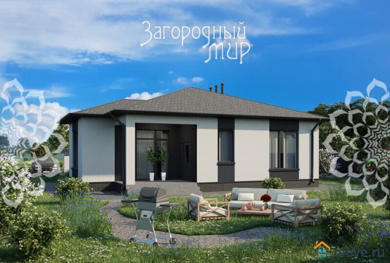 Построенный из газобетонных блоков D400 на монолитной плите, внешне дом отделан штукатуркой "Короед" и покрашен фасадной краской. Кровля - мягкая черепица, окна - стеклопакеты. В доме запланированы: кухня-гостиная, 3 спальни (одна из них - мастер-спальня), холл, 3 с/у, бойлерная, терраса.