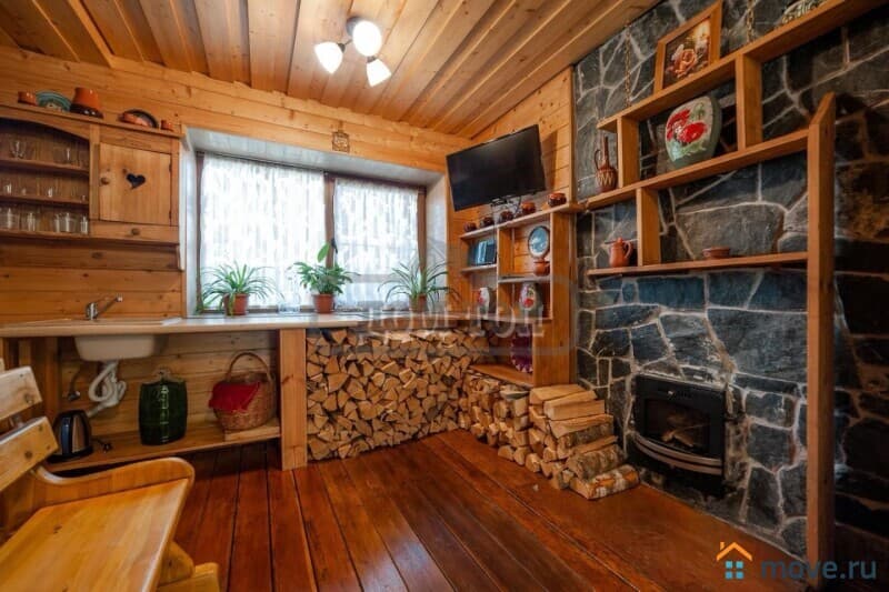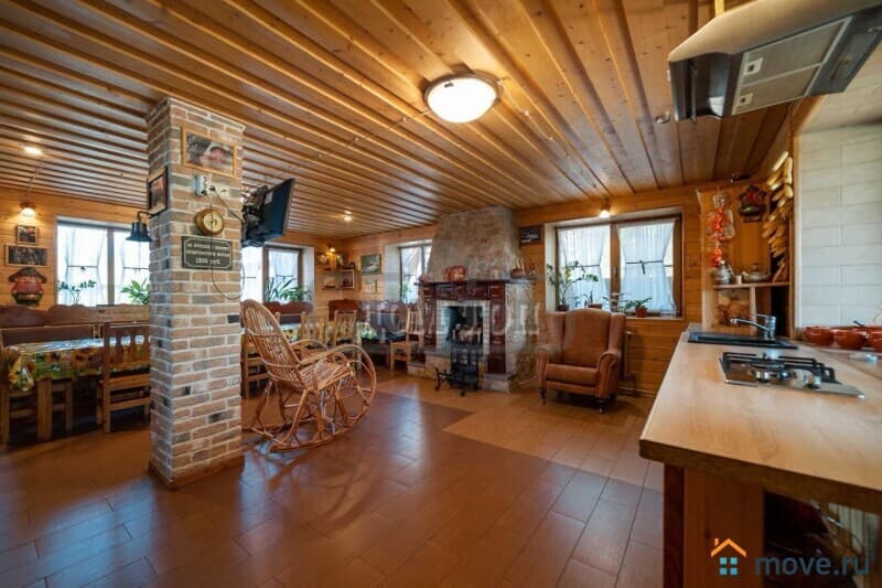В основном доме на 1 этаже: зал с камином с мягкими кресалами, кухня с обеденным столом и угловым диваном, санузел, ванная. Оснащение: музыкальный центр, телевизор.
