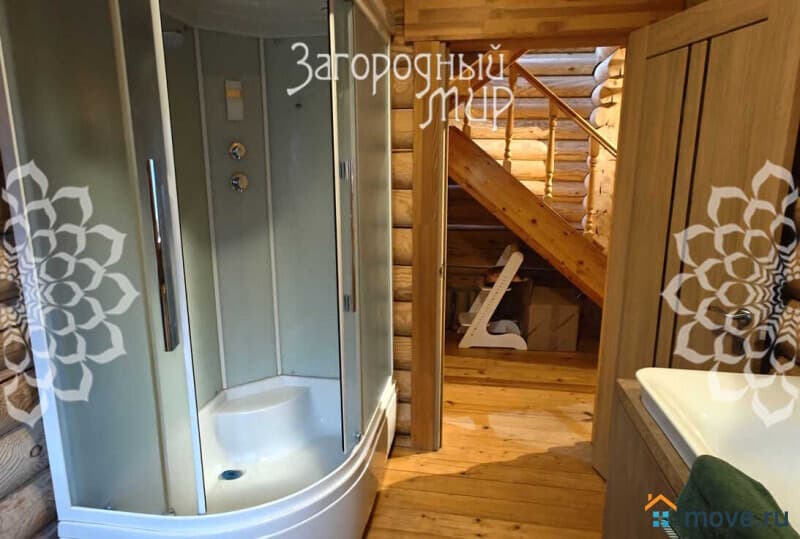 Дом двухэтажный, тёплый, сруб из оцилиндрованного бревна диаметром 220, на ленточном железобетонном фундаменте, окна двухкамерные стеклопакеты (три стекла). Кровля - металлочерепица с утеплением. Дом (и весь участок) находится на возвышении, площадка перед домом и парковка замощены плиткой. Большое крытое крыльцо, солидная дверь в прихожую. Из неё можно попасть в спальню первого этажа, удобно разместить гостей или пожилых родственников. Рядом санузел с душевой кабиной. Дальше проход в просторную гостиную, столовую и кухонную зону, оборудованную всей необходимой техникой: холодильник, плита с вытяжкой, духовка, посудомойка. Мини остров с барными стульями. Рядом обеденный стол на большую компанию. В гостиной мягкий диван перед телевизором. Можно устраивать посиделки всей семьёй и принимать гостей. В летнюю погоду можно выйти на крытую террасу с видом на красивый участок, здесь так же есть стол и кресла, выпить утренний кофе, или ещё что то вечером. С террасы отдельный вход в техническое помещение с газовым котлом, бойлером и всем оборудованием. Оно же используется под хранение инвентаря и инструментов. На втором этаже санузел и три просторных спальни, одна проходная, две изолированные с выходом на балкон. С балкона открывается отличный вид на выходящую к реке улицу посёлка.