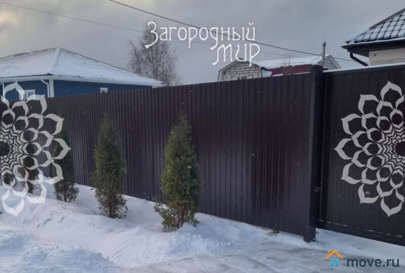 Участок 13 соток с газоном огорожен забором из металлопрофиля с откатными воротами. Перед домом забетонированная площадка на 2 автомобиля.