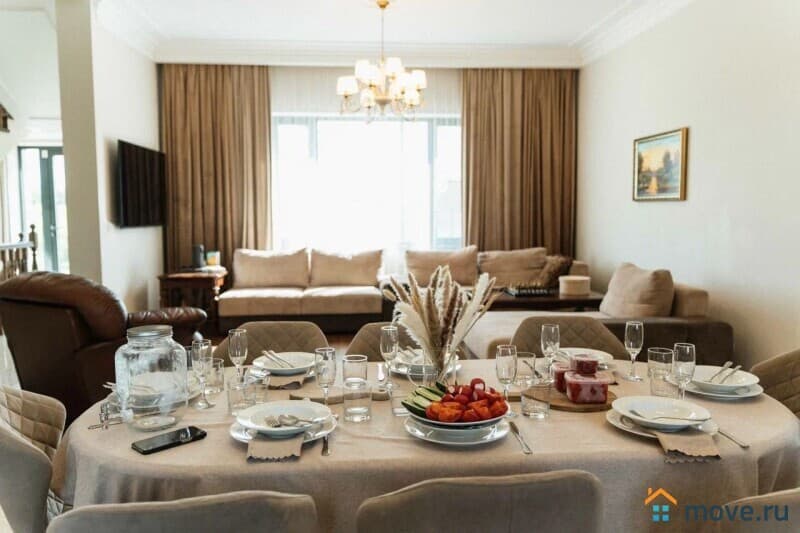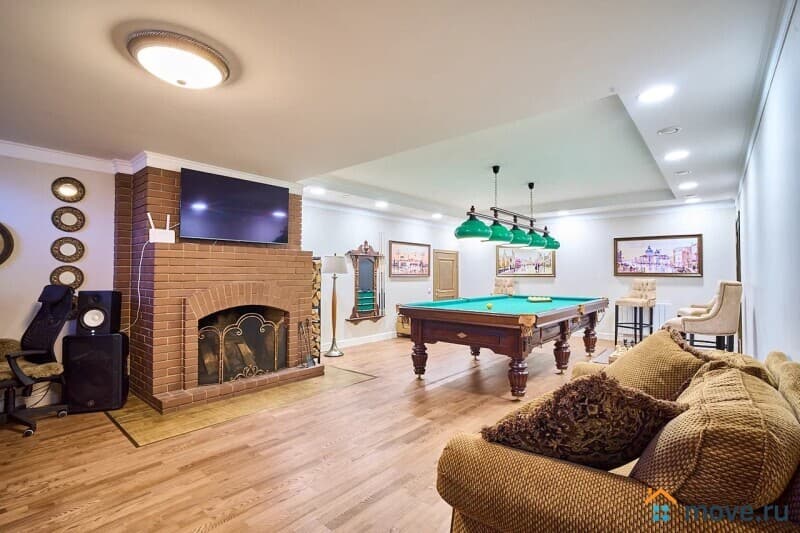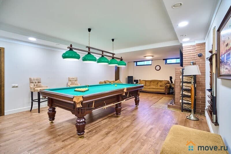 На цокольном этаже: каминный зал с диваном и бильярдом, профессиональный караоке, профессиональная аудиосистема, детская игровая с аэрохоккеем, прачечная, с/у, кладовая.