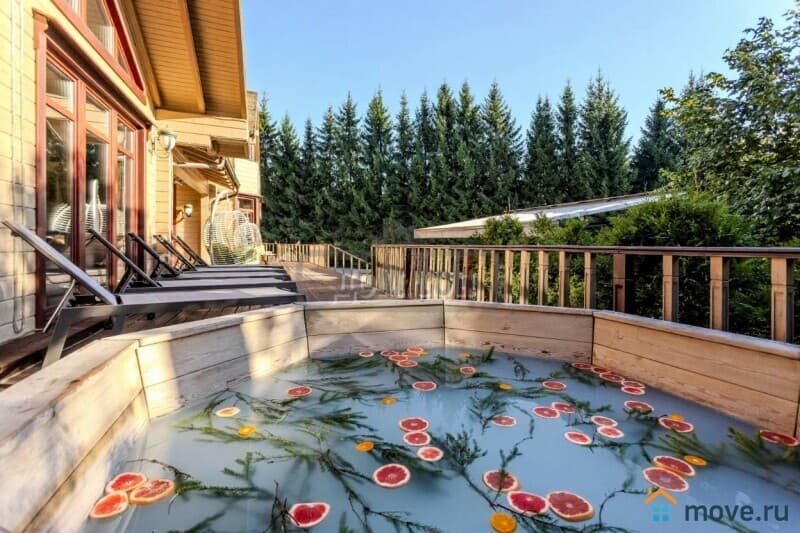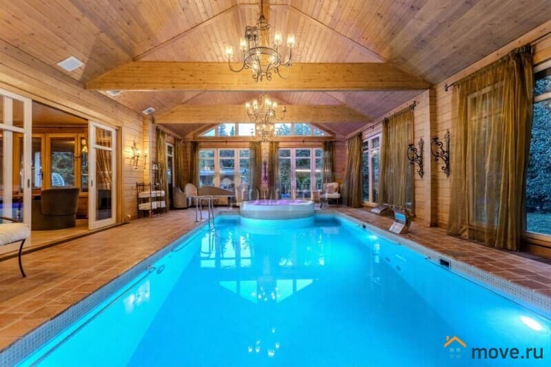 СПА-зона с выходом на террасу: турецкий хаммам, каминный зал, купель с холодной водой, русская баня на дровах, большой теплый бассейн с водопадом, панорамное остекление, лежаки с мягкими пуфами, джакузи с цветной подсветкой и многими другими опциями.