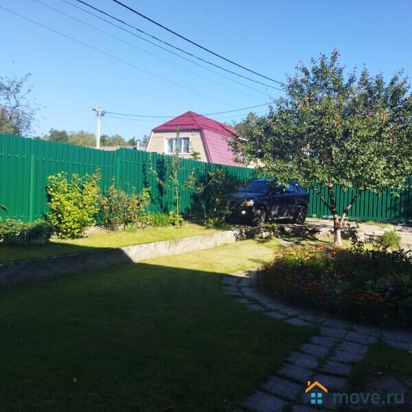 На участке место для парковки 2 машин, свежепостроенный сарай и беседка с мебелью, новый забор и откатные ворота, площадка и газон.