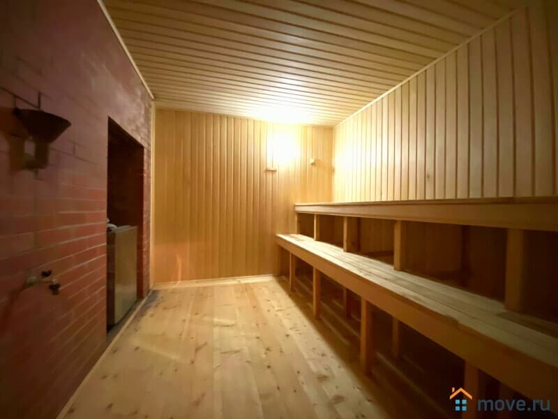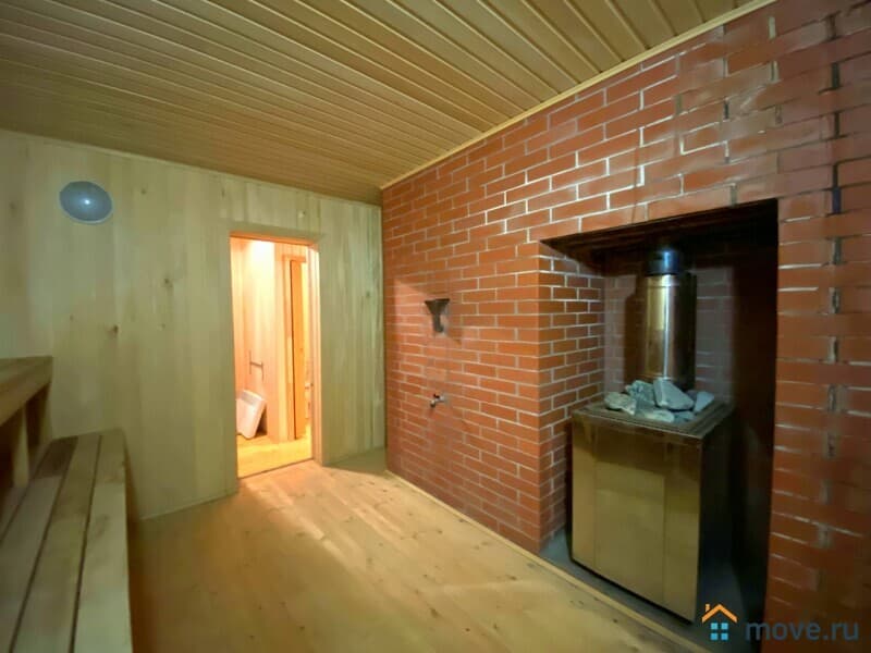 Первый этаж: просторная прихожая, кухня, уютная сауна для расслабления и восстановления сил, комфортабельная парная с тёплыми деревянными полками, душевая кабина, санузел оформленный в стиле минимализма, большой зал с камином создаёт атмосферу тепла и уюта, предлагая:
