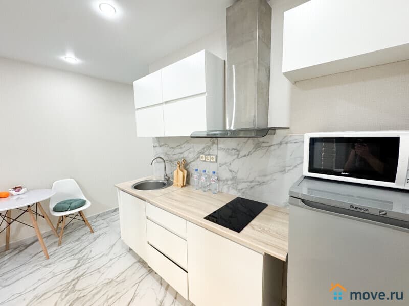 ?? Кухня с техникой: холодильник, плита, микроволновка, чайник.