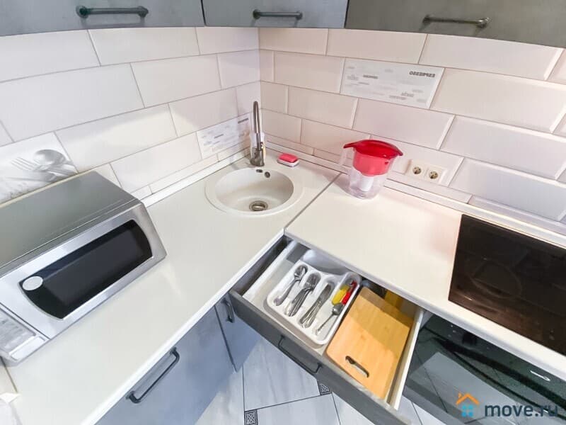 ?? Кухня с техникой: холодильник, плита, микроволновка, чайник.