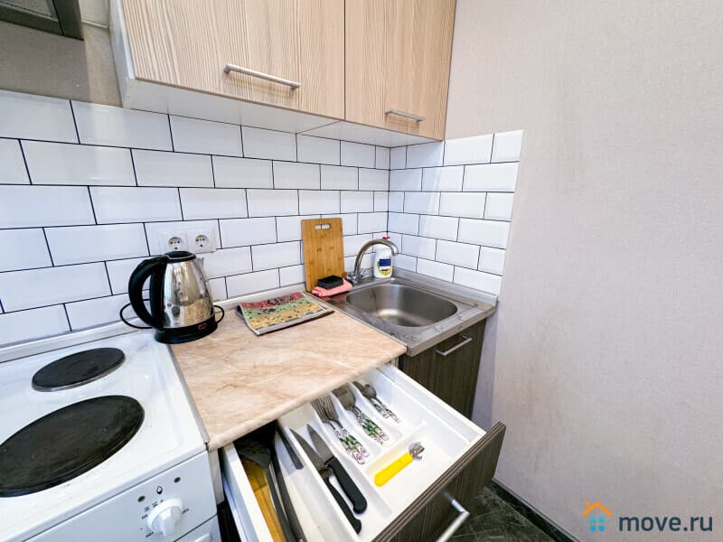 ?? Кухня с техникой: холодильник, плита, микроволновка, чайник.
