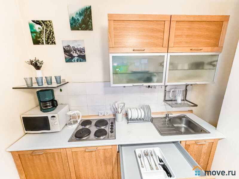 ?? Кухня с техникой: холодильник, плита, микроволновка, чайник.