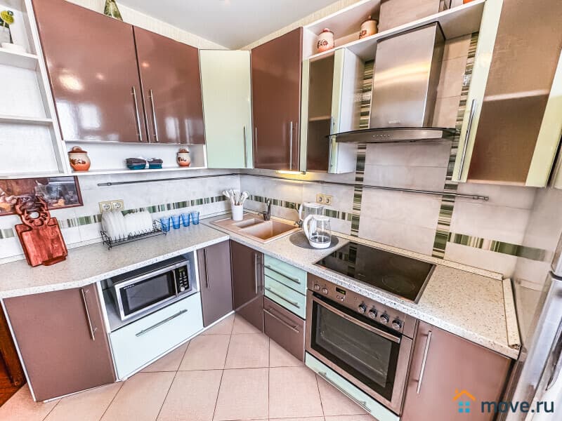?? Кухня с техникой: холодильник, плита, микроволновка, чайник.