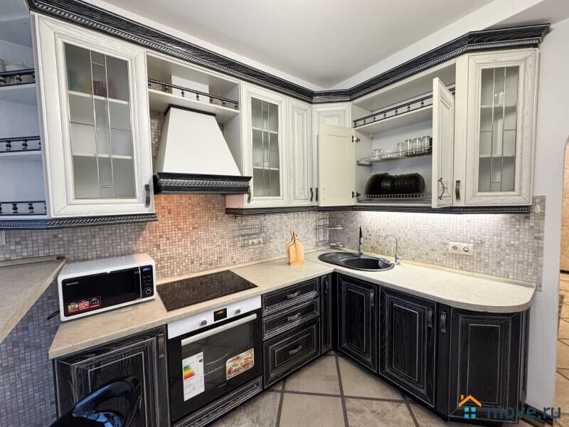 ?? Кухня с техникой: холодильник, плита, микроволновка, чайник.