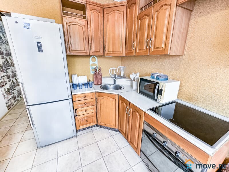 ?? Кухня с техникой: холодильник, плита, микроволновка, чайник.