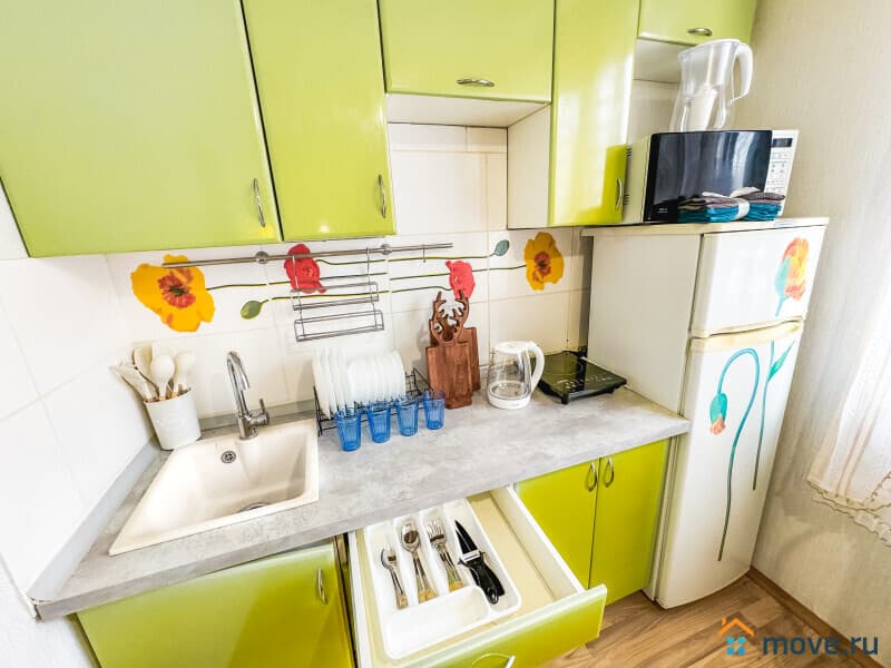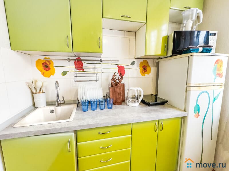 ?? Кухня с техникой: холодильник, плита, микроволновка, чайник.