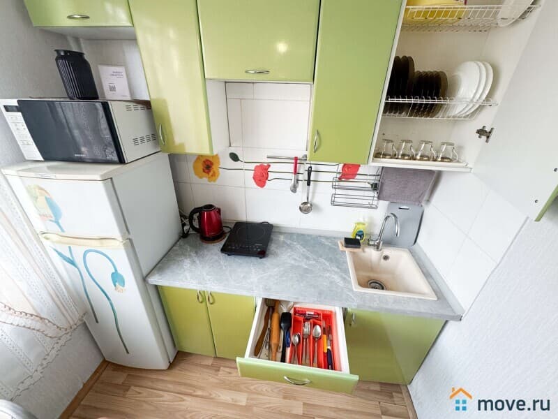 ?? Кухня с техникой: холодильник, плита, микроволновка, чайник.