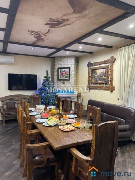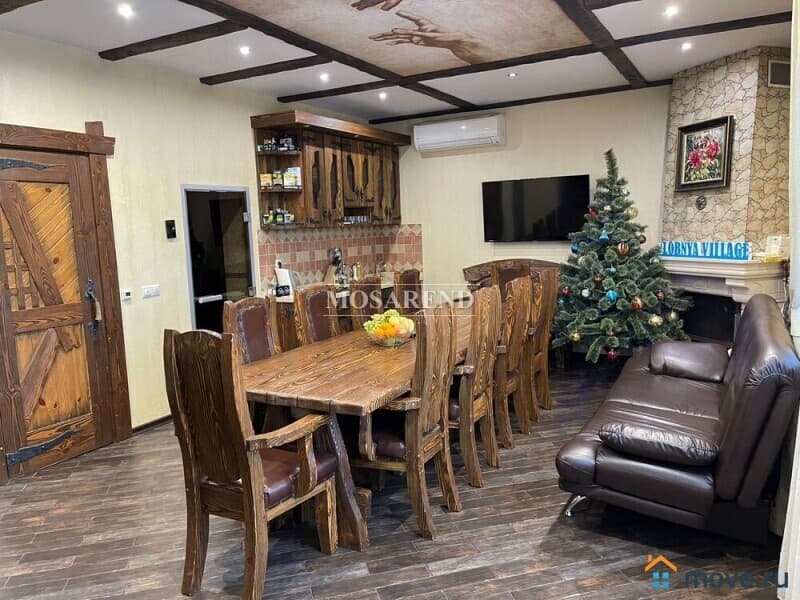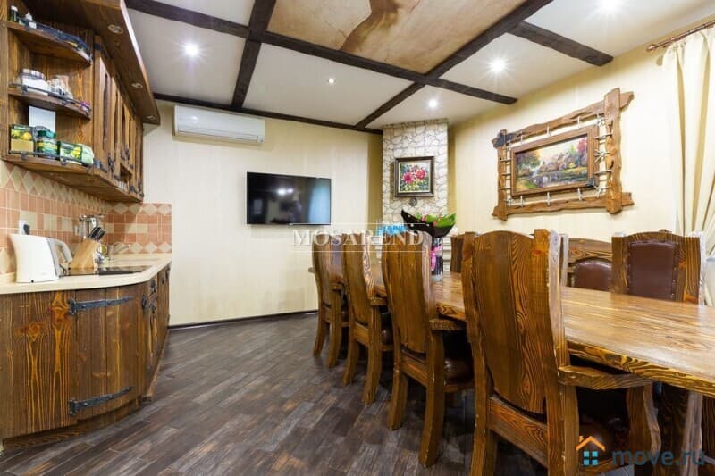 - просторная кухня-столовая со всем необходимым набором посуды и бытовой техники Bosch, трапезный стол и стулья на 12-14 человек, ТВ Samsung, диван