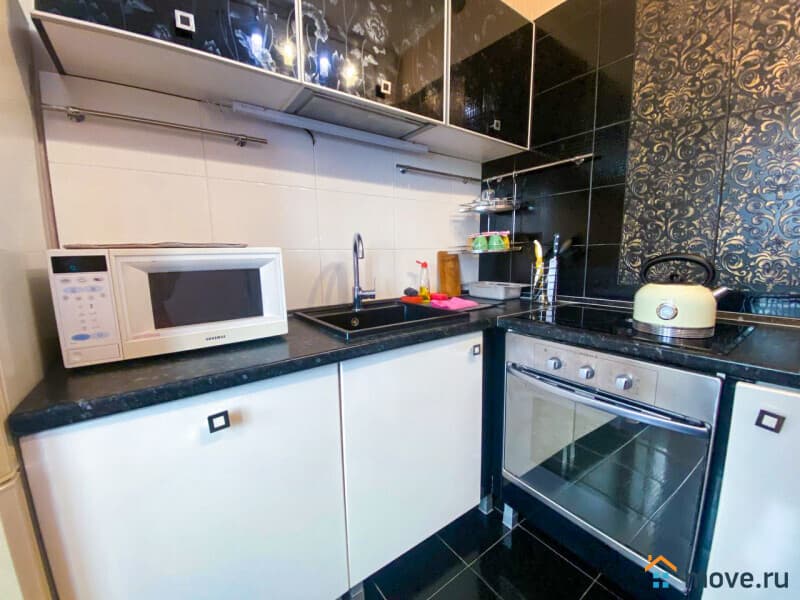 ?? Кухня с техникой: холодильник, плита, микроволновка, чайник.