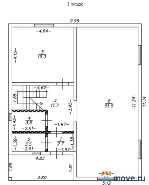- 1 этаж: Крыльцо, прихожка, бойлерная, санузел, коридор, спальня 19,3 кв.м. , кухня-гостиная 51,9 кв.м.