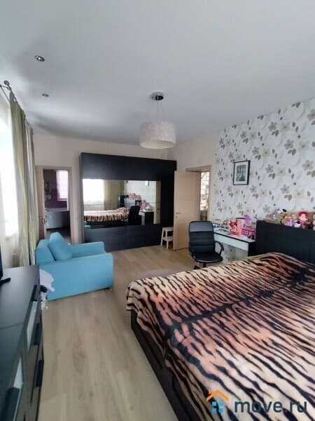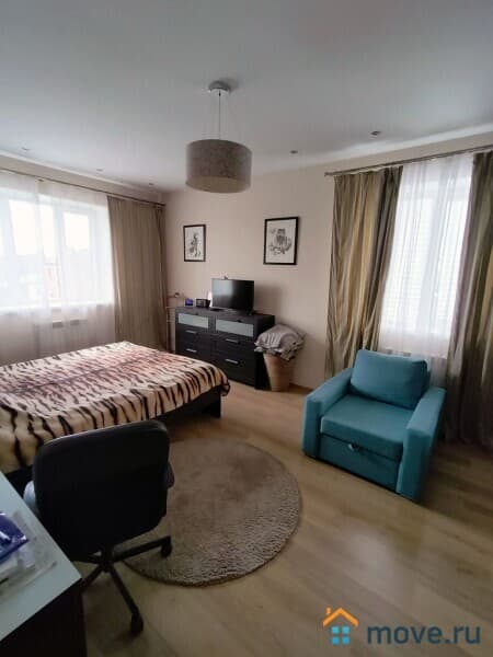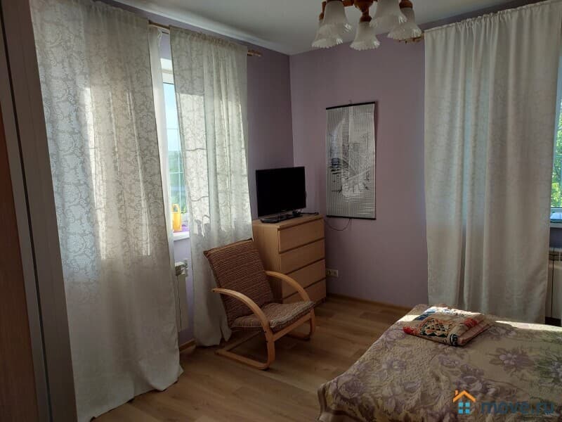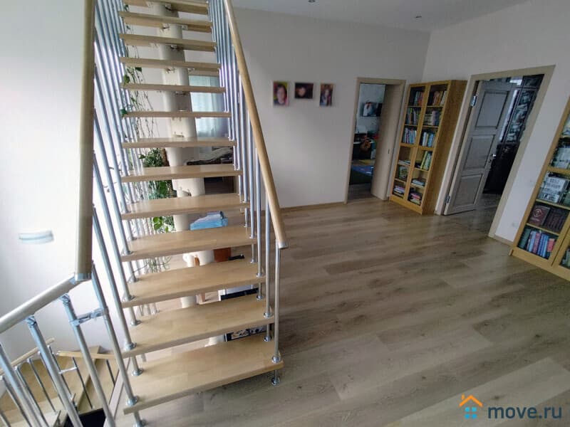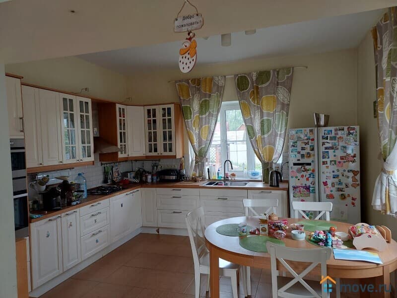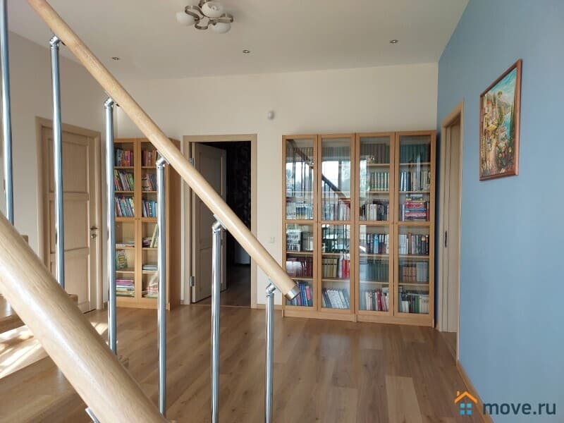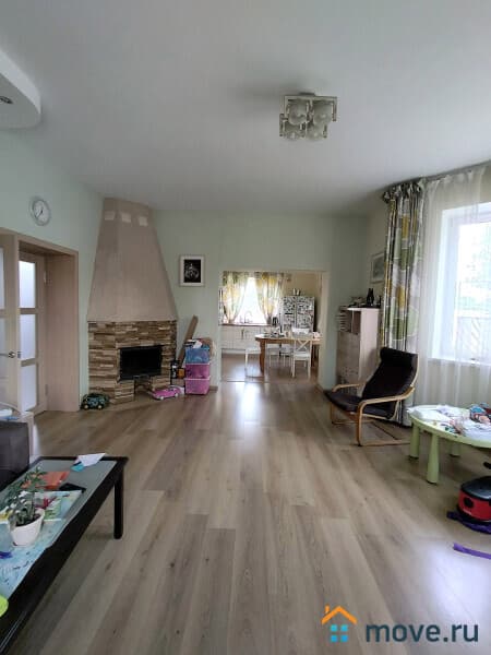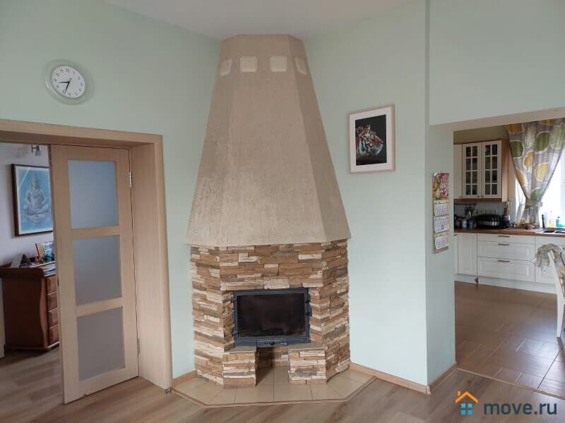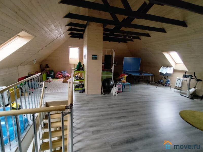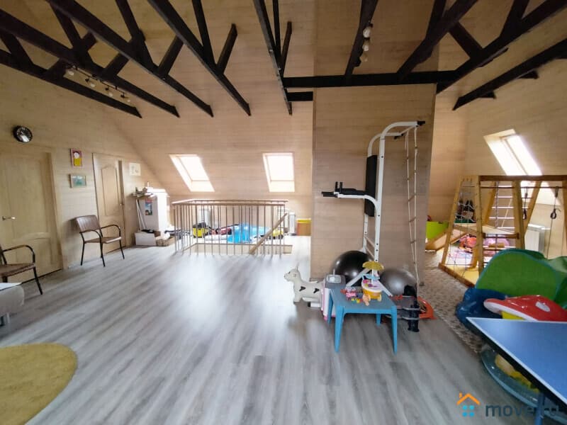 В доме: кухня, гостиная с камином, 4 спальни, постирочная, кабинет, 3 санузла. Полностью меблирован. Третий полноценный мансардный этаж в стиле openspace — оборудован как игровая и спортивная площадка, здесь разместились: настольный теннис, тренажеры, детская горка и пр., есть подсобные помещения для хранения.