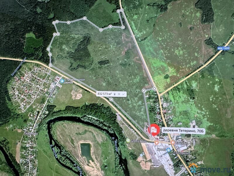 С двух сторон участка асфальтированные дороги Можайск-Поречье и Можайск-Руза, за деревней Тетерино и напротив деревни Тихоново через дорогу и с двух сторон шикарный лес. Строительный рынок "ГРОСС" напротив участка (30 метров).