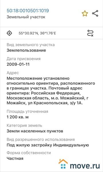 Продается земельный участок 12 соток ИЖС по адресу: город Можайск, ул. Краснопольская, 1А, Можайского городского округа, Московской области в 300 метрах от парка "Ривьера" и в 400 от Москва реки.
