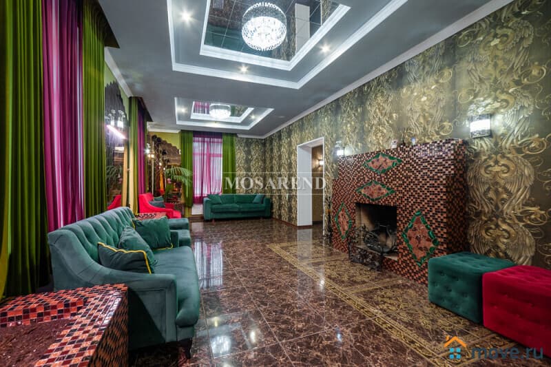 -зеркальный банкетный зал на 40 посадочных мест в восточном стиле с обилием диванов, живой пальмой и камином