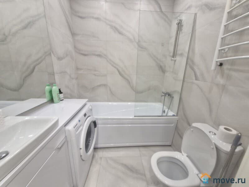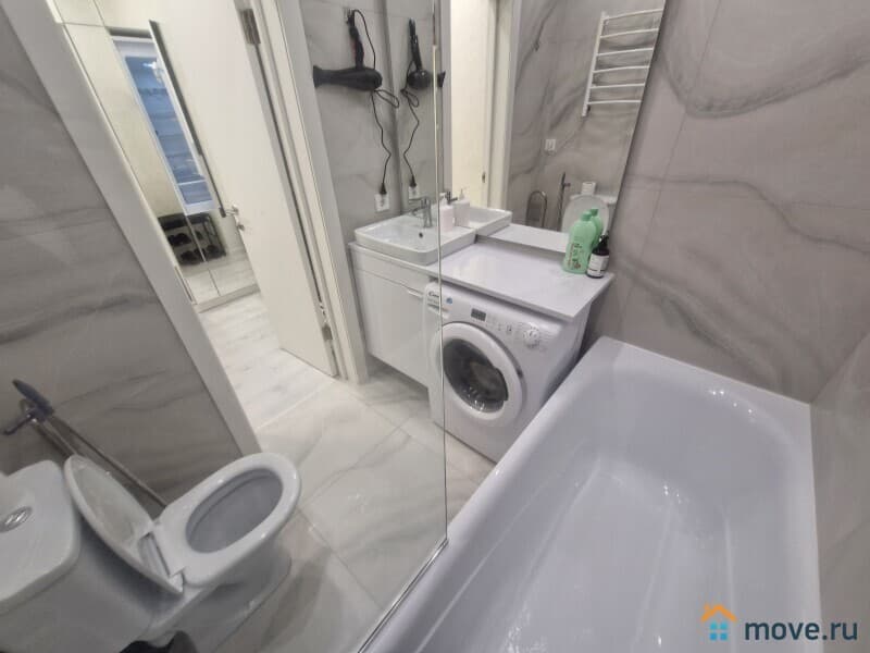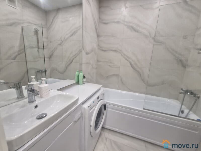 В ванной есть стиральная машина, туалетные принадлежности, полотенца,тапочки. Большие зеркала в полный рост.