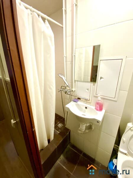 В ванной комнате - душ, туалет, раковина.
