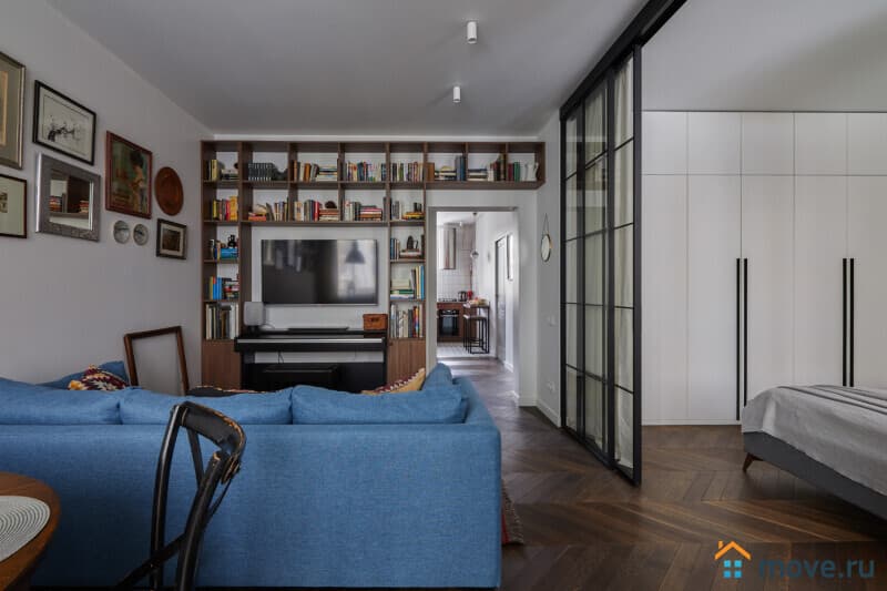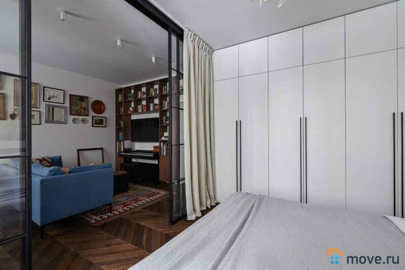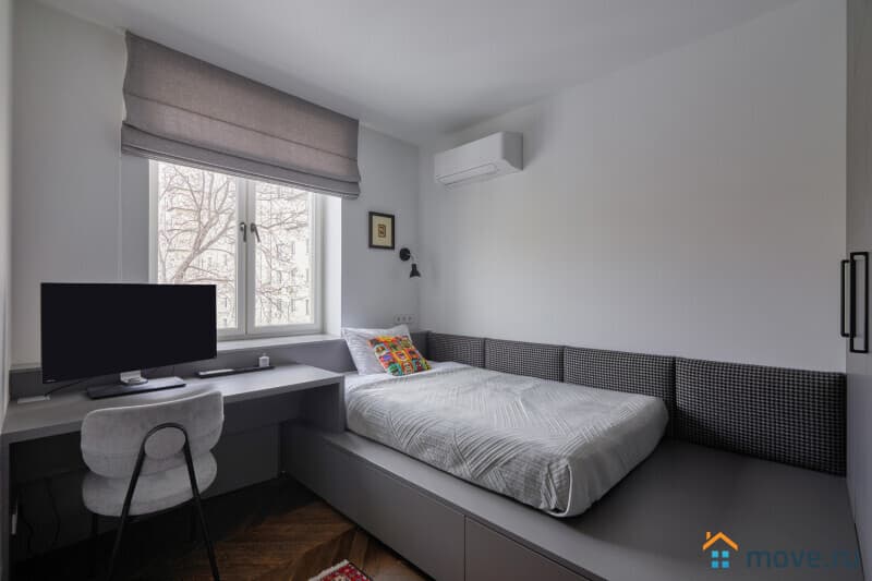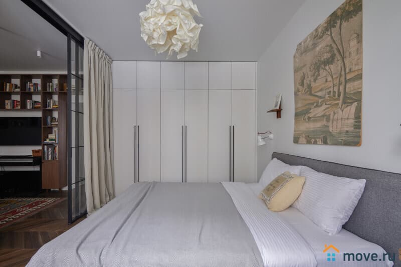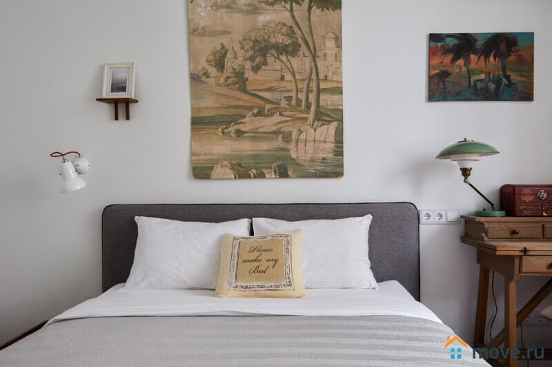 Большая светлая комната для двоих отделена от гостиной перегородкой, здесь расположена двуспальная (160х200) кровать, большая гардеробная и уникальный винтажный туалетный столик из Франции. В квартире прекрасная звукоизоляция, звуки соседей не потревожат ваш сон.