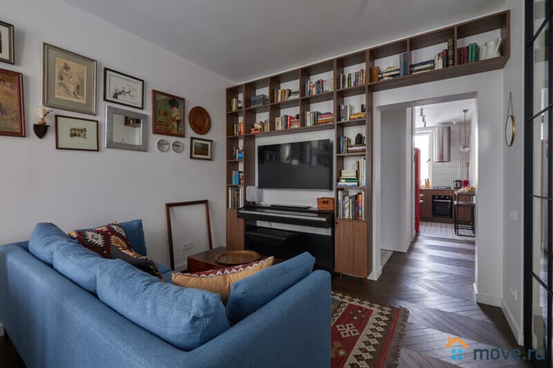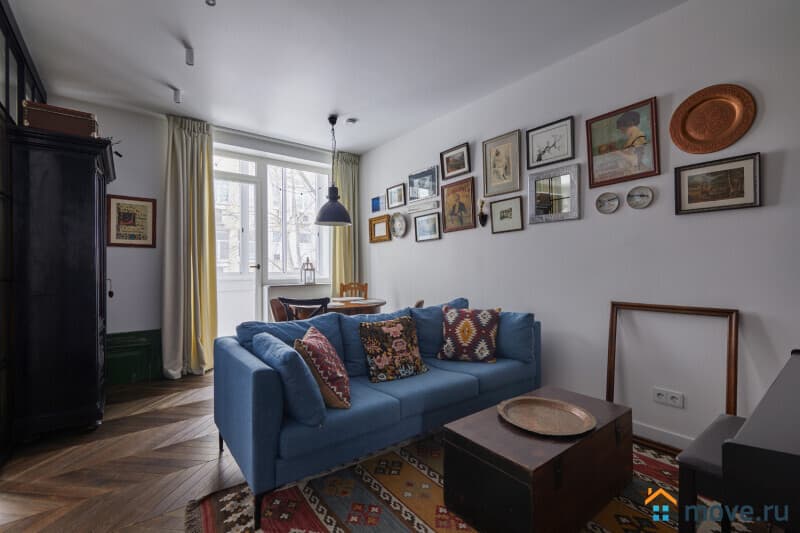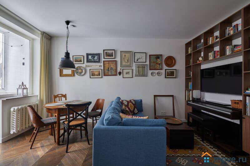 Гостиная - пространство, где каждая деталь рассказывает свою историю. Антикварные буфет, сундук, чемодан, старинные постеры на стене и коллекция книг - обстановка гостиной оставит незабываемые впечатления. В квартире имеется электропианино, в сундуке вы найдете интересные коллективные игры, а также большой телевизор и безлимитный Wi-Fi (входит в стоимость) дополнят комфортное пребывание в квартире.