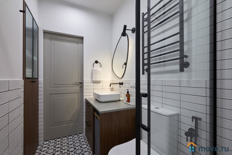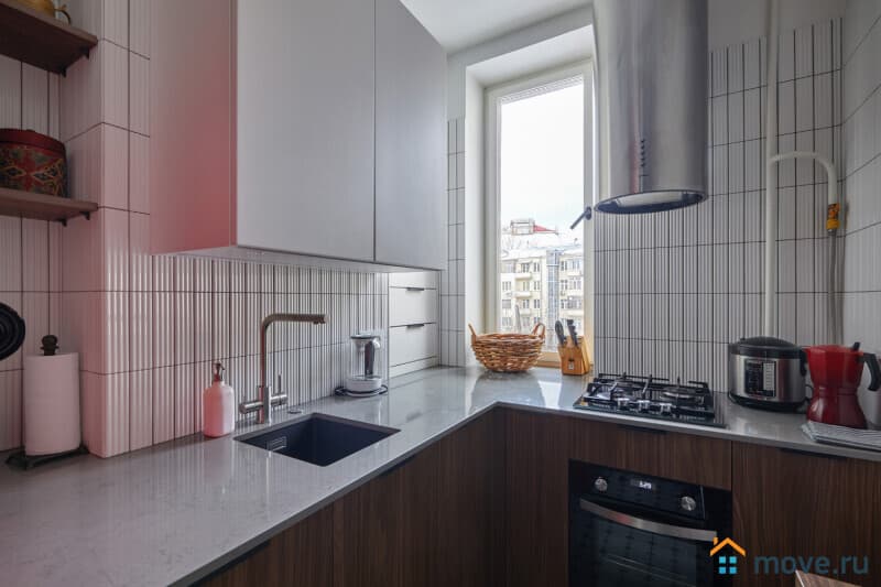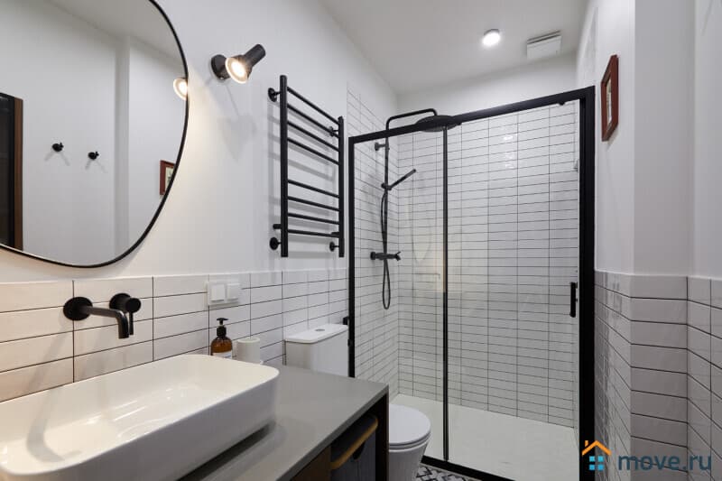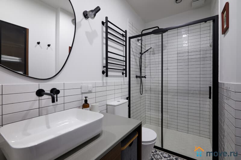 Кухня и ванная помещения с современным стильным интерьером и наличием необходимой бытовой техники. Кухня оснащена газовой плитой с духовкой, мультиваркой, кофеваркой, холодильником. Совмещенный санузел с просторной душевой кабиной и гигиеническими наборами.