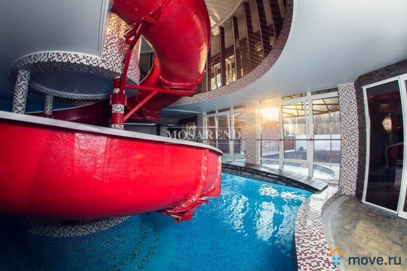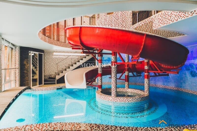 Для отличного отдыха имеется горка как в настоящем аквапарке, большой тёплый бассейн с подныром на улицу в любое время года. Также вы можете воспользоваться сауной на дровах. Участок находится в окружении леса.