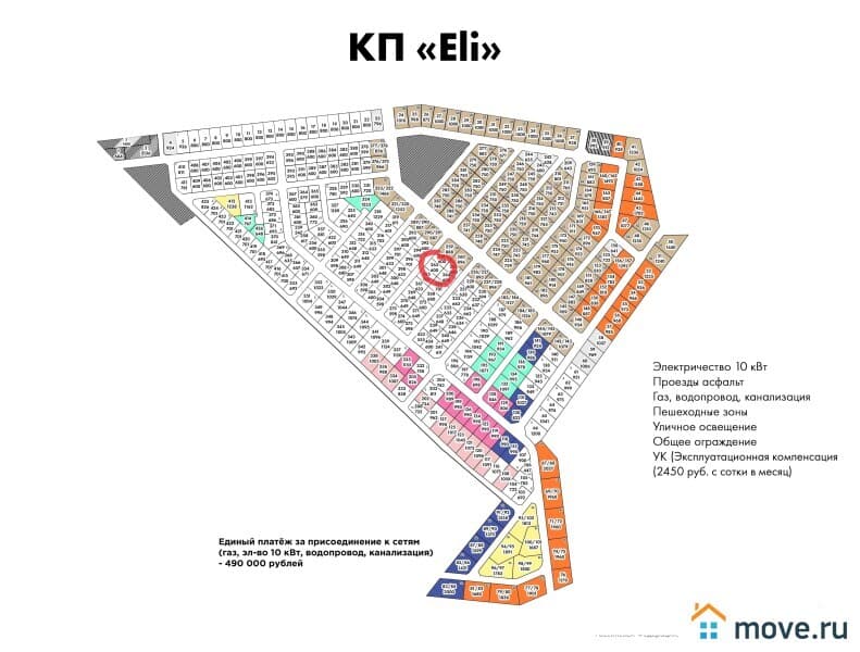 Центральные коммуникации в поселке: электричество 10 кВт, газ, водопровод, канализация, кирпичные столбы по фасаду участка. Стоимость пакета коммуникаций всего 490.000 рублей, оплачивается отдельно