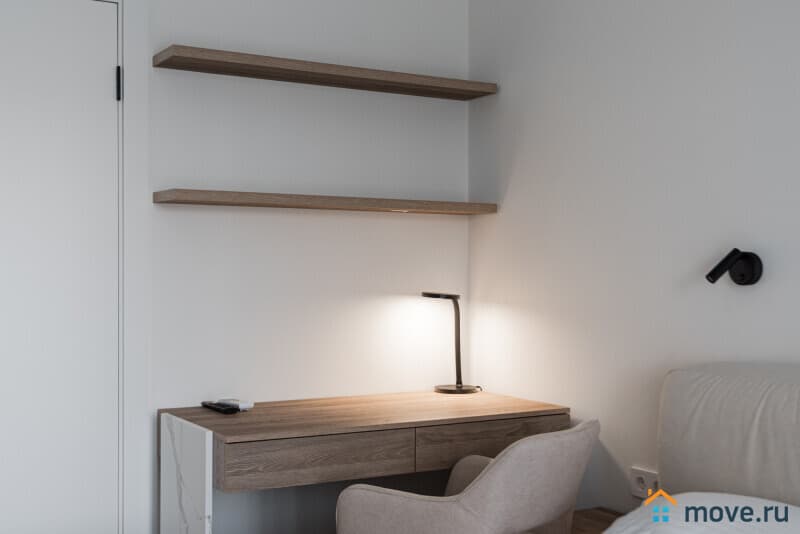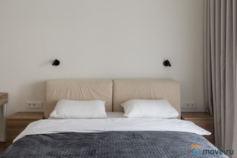 Светлая, уютная квартира с панорамными окнами и дизайнерской отделкой. Пространство зонировано: спальня, кухня, рабочая зона. Спокойные оттенки, натуральные материалы и мягкое освещение создают атмосферу уюта и комфорта.