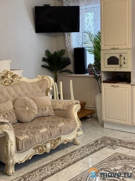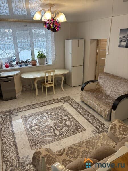 - Уютная гостиная с раскладным диваном, совмещённая с кухней и обеденной зоной.