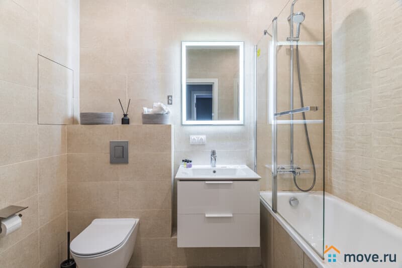 Современная ванная с ванной, душевой перегородкой и подсветкой