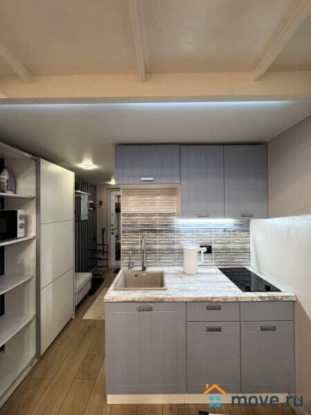 Кухонная зона оснащена техникой для приготовления пищи: микроволновая печь, холодильник, плита, чайник, столовые приборы, кастрюля, обеденный стол.
